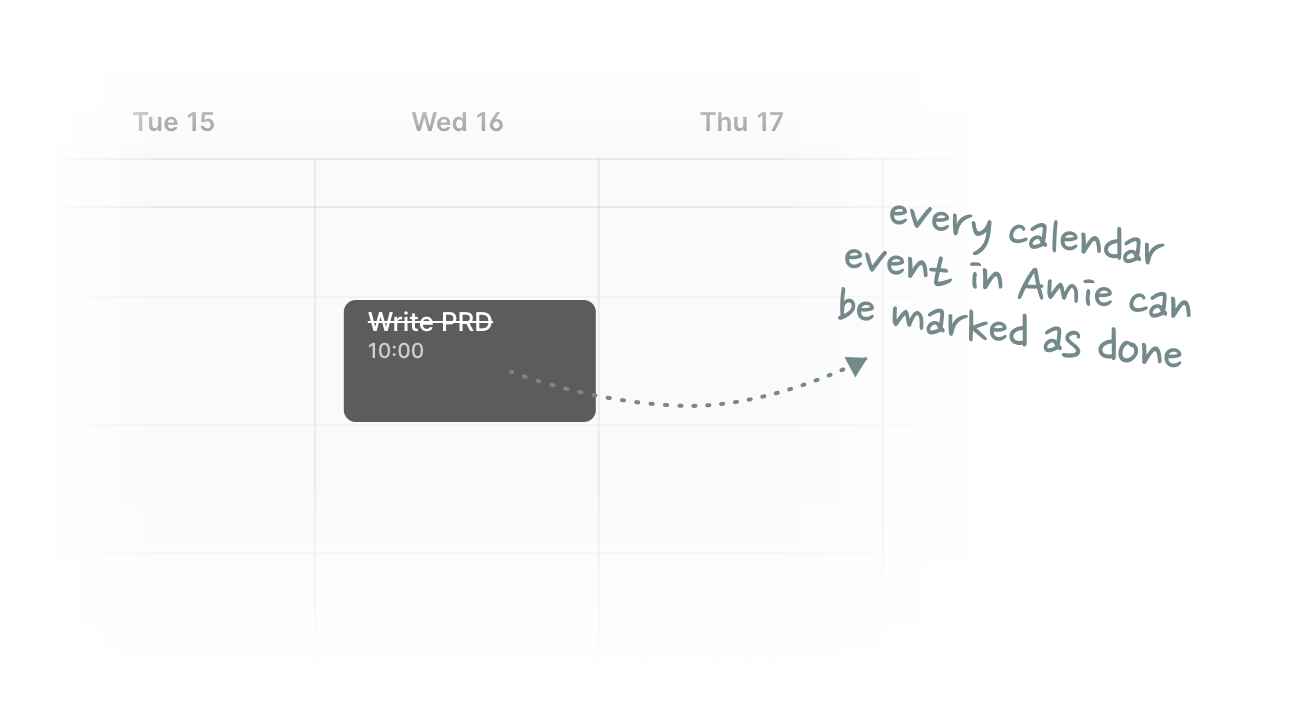New productivity tools such as Amie are trying to solve this problem by natively inserting todo lists into the calendar experience. In Amie, every calendar event is a task that can be marked as done.